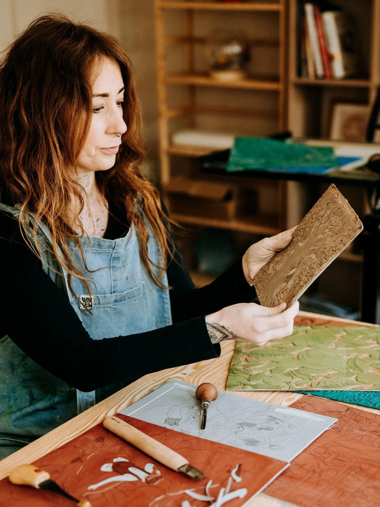 Nicole is a relief printmaker and illustrator based in Dorset, England, creating lino and woodcut prints under the name Prints by the Bay. With a degree in Illustration from the Arts University Bournemouth (AUB), Nicole brings a narrative-driven approach to her work, weaving together her artistic practice with a deep interest in storytelling, folklore, and the exploration of human experience.