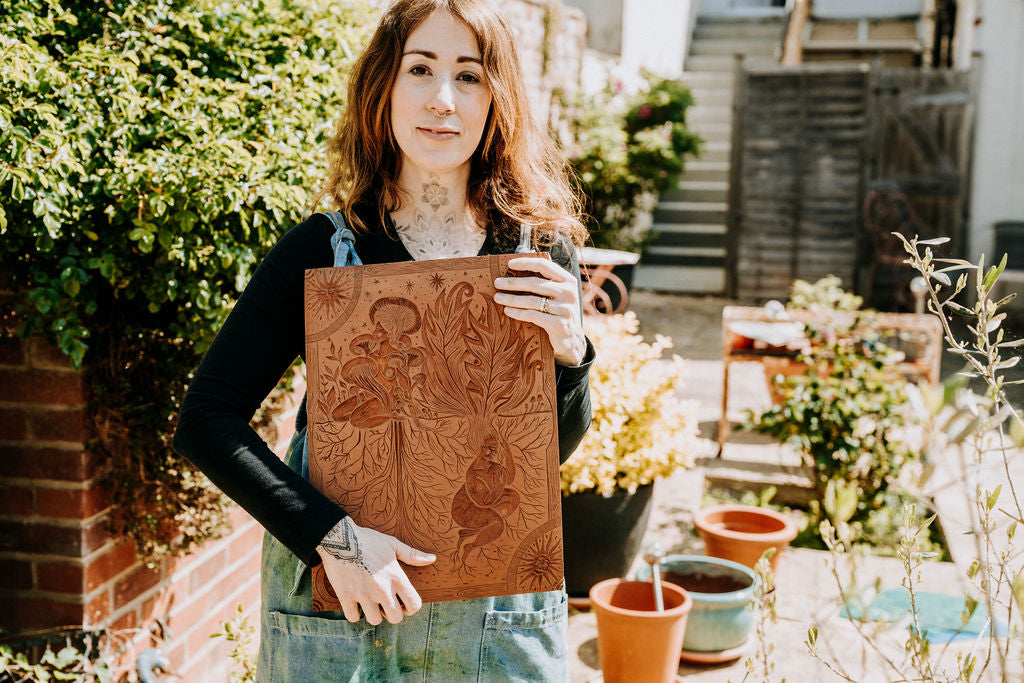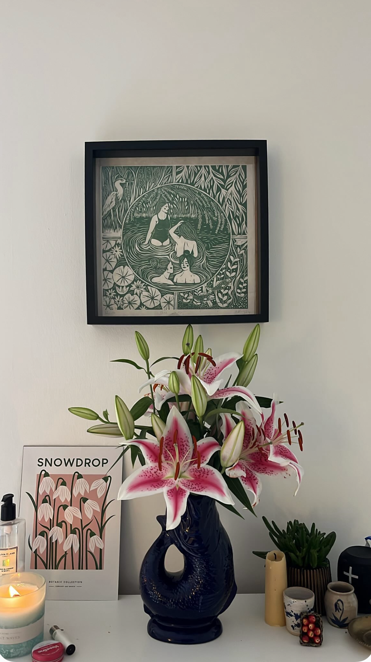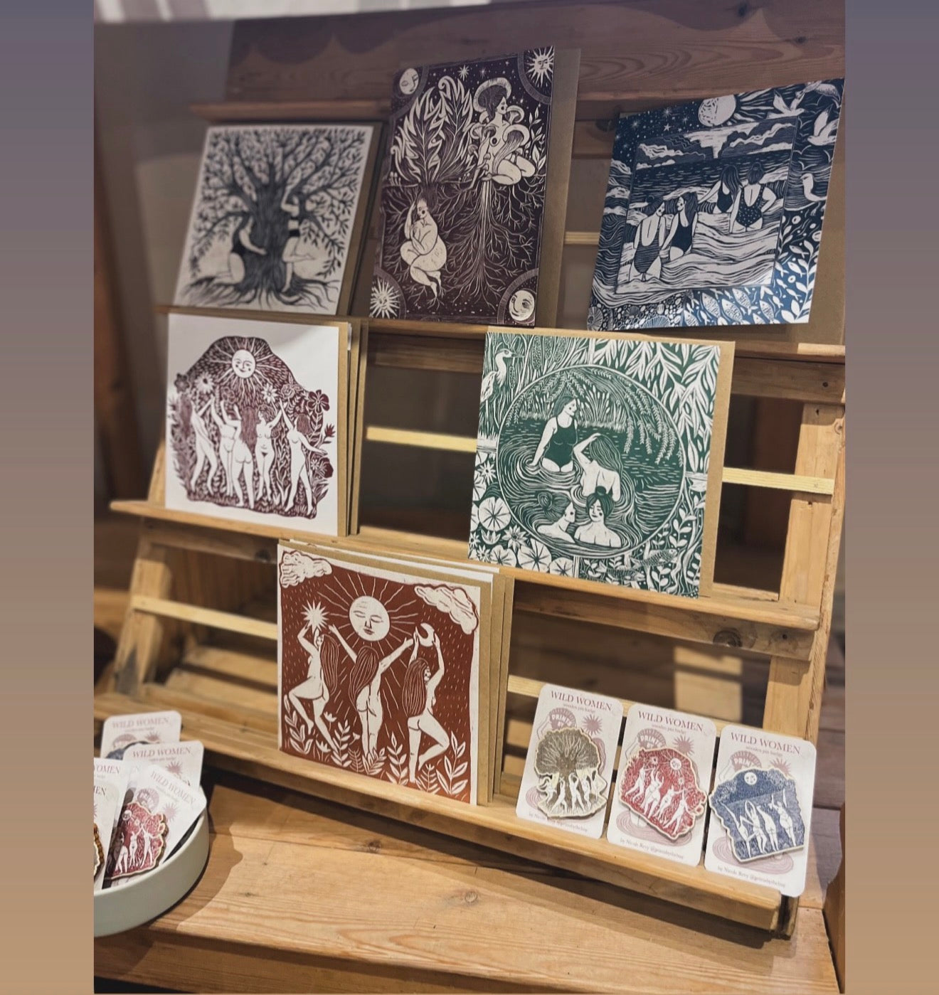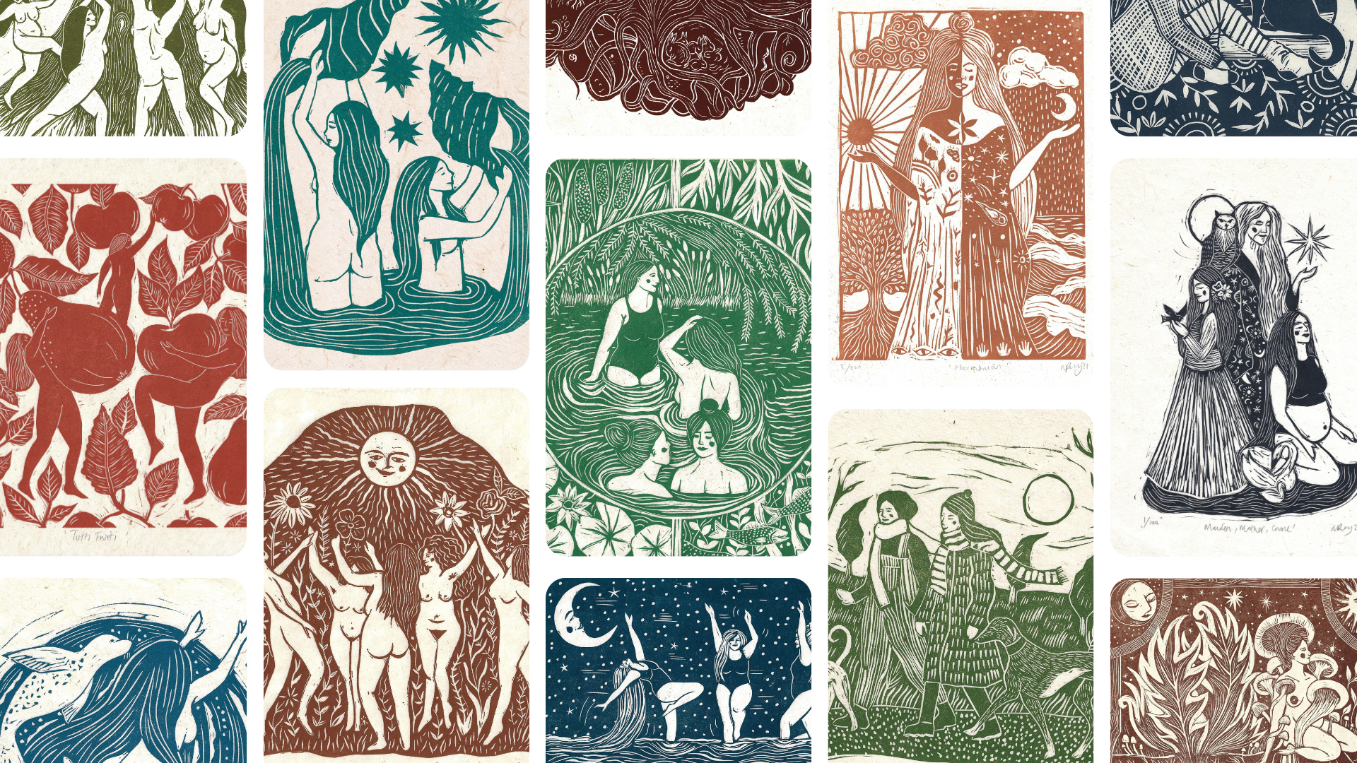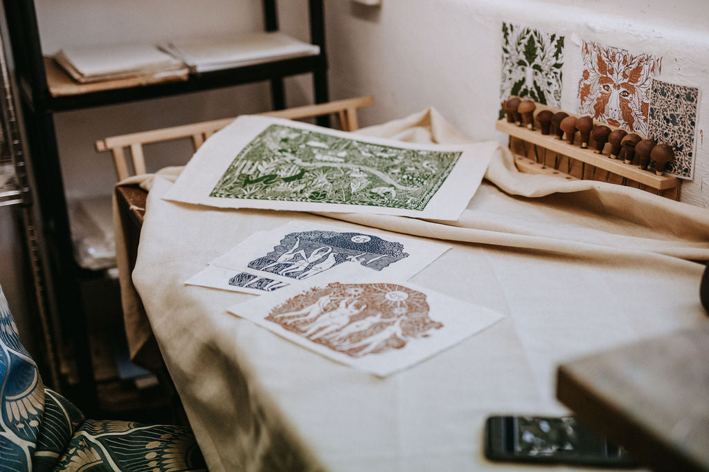 My prints are born slowly by the coast- in my little studio in West Dorset I carve, ink, and print everything by hand. It’s slow, messy and magical- and this process is imbued in every print, where I weave together tales of women, the land and the sea.