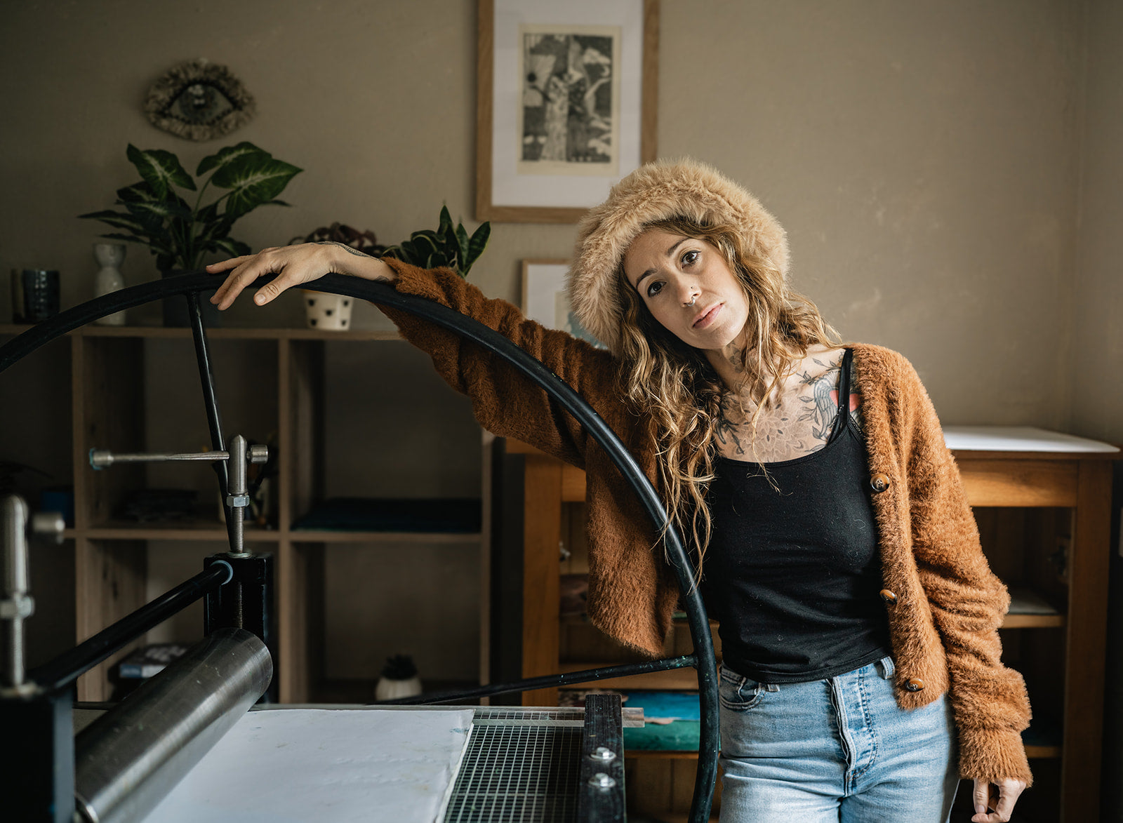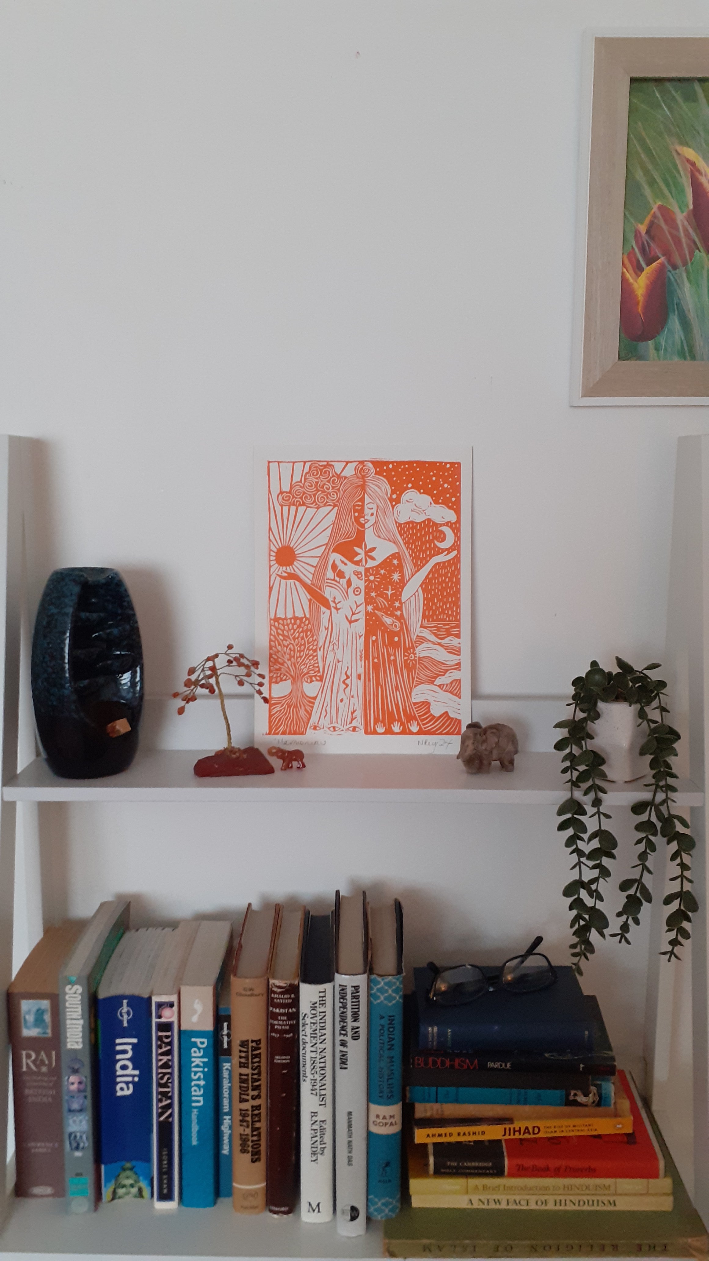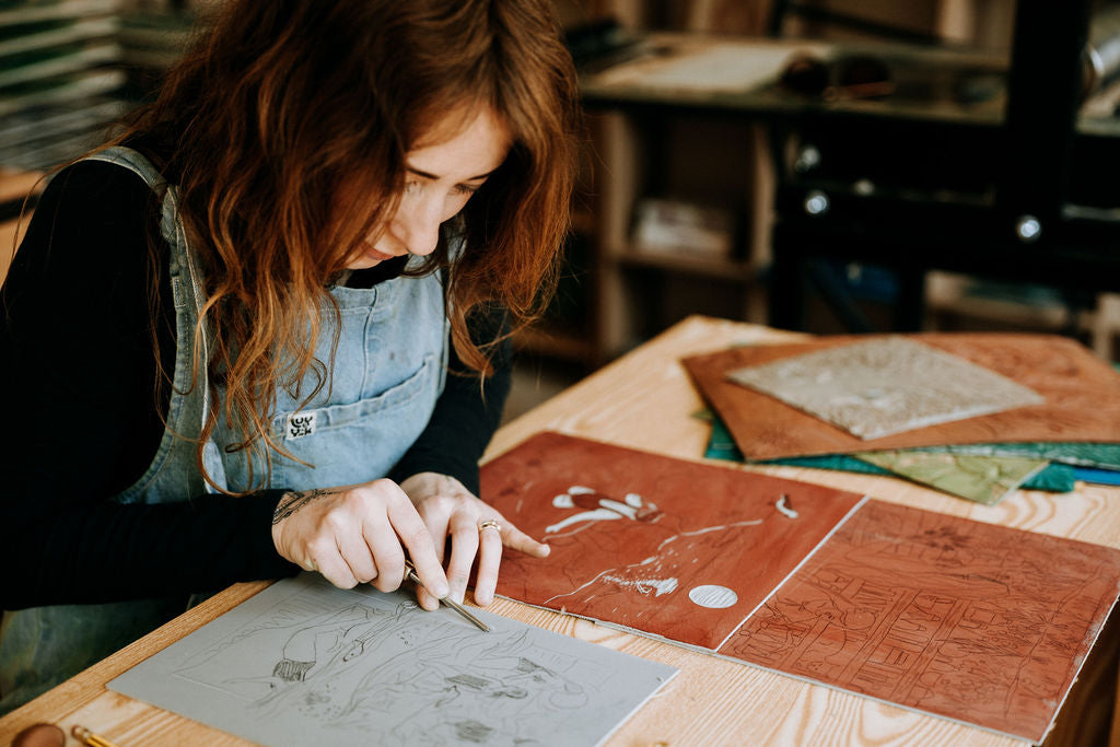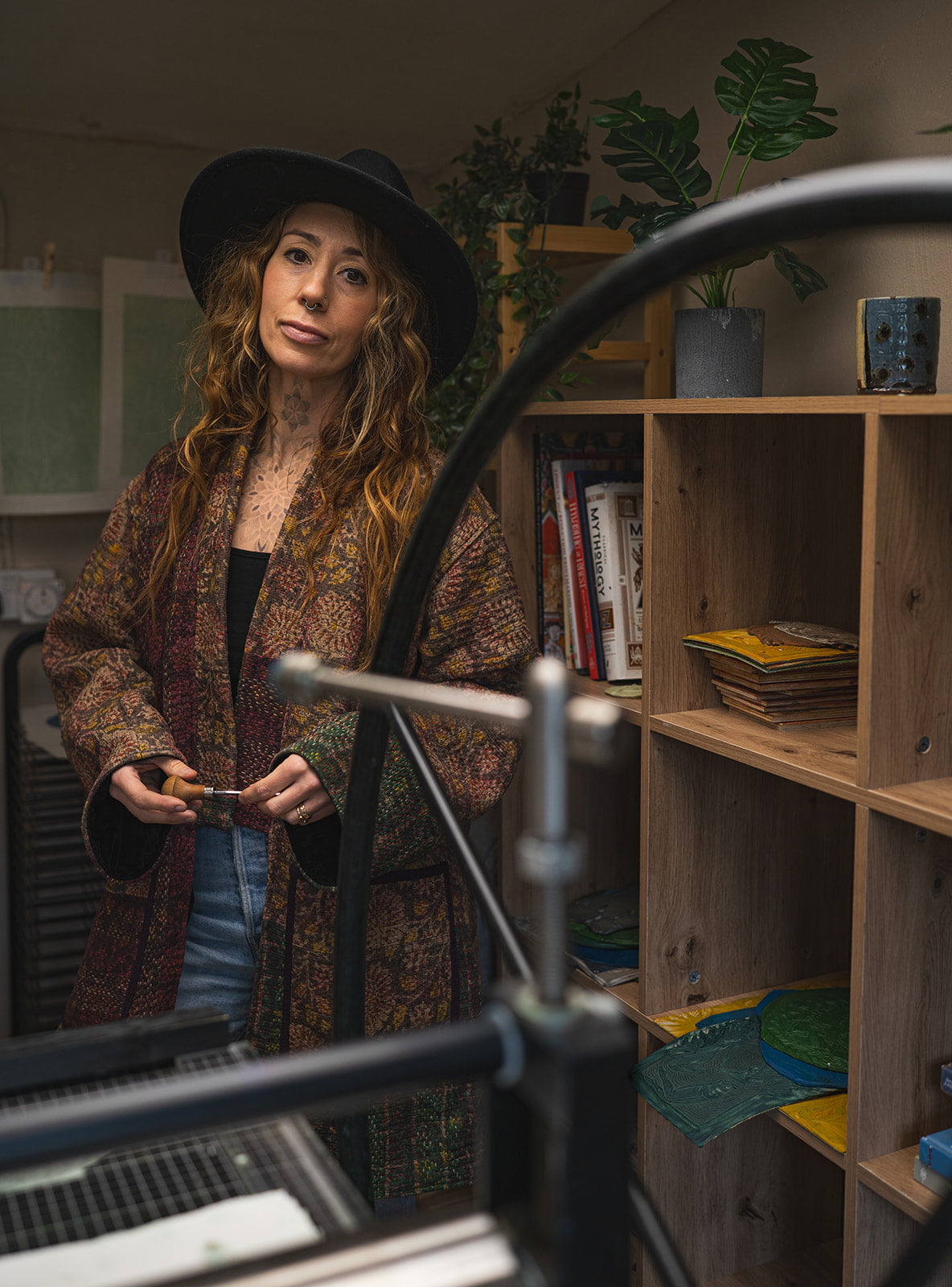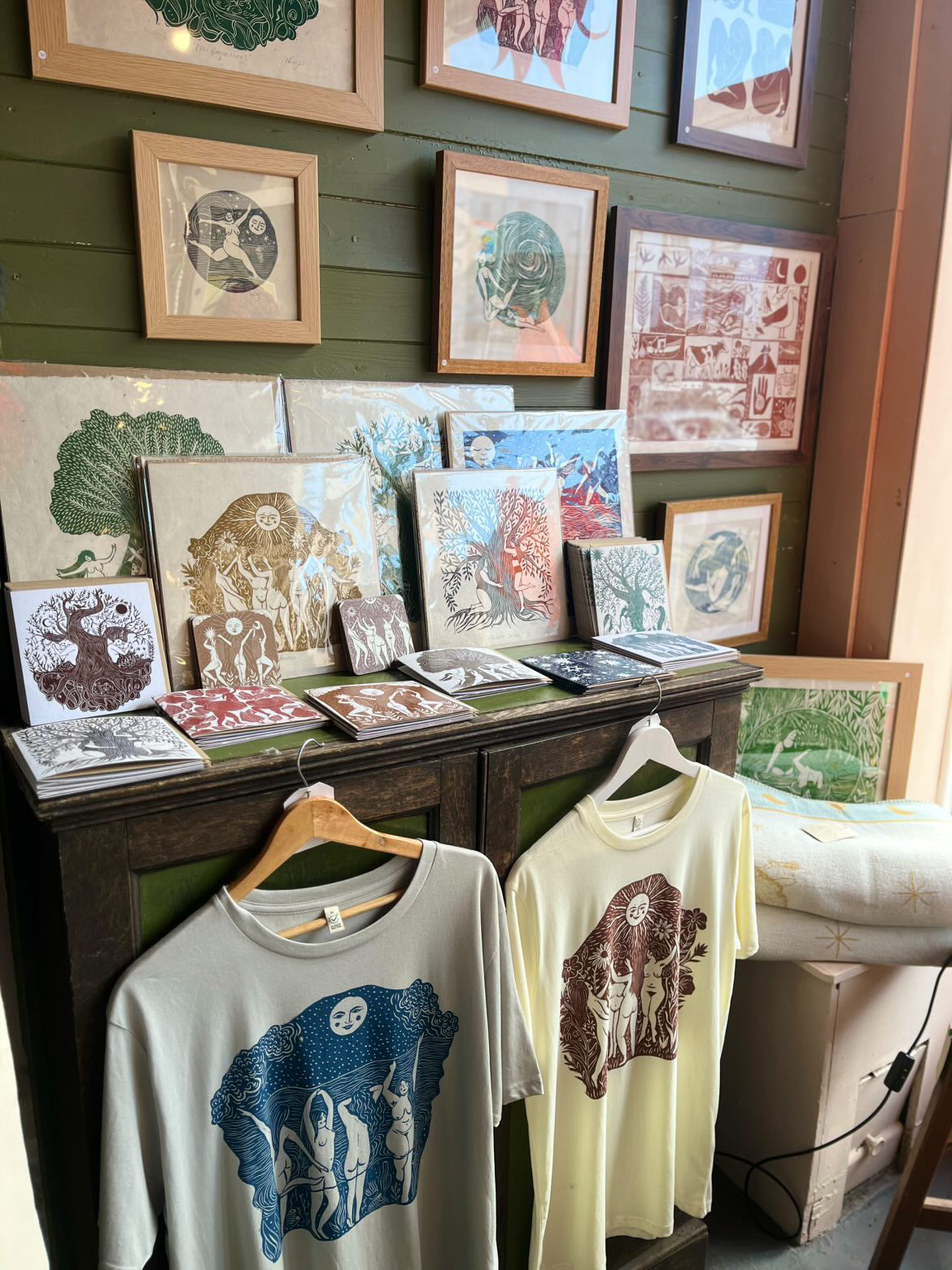 My prints are born slowly by the coast- in my little studio in West Dorset I carve, ink, and print everything by hand. It’s slow, messy and magical- and this process is imbued in every print, where I weave together tales of women, the land and the sea.