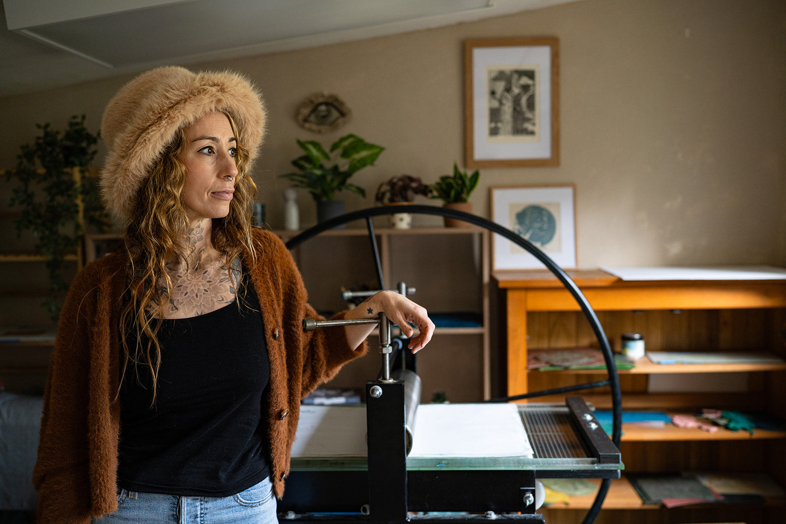 Nicole Revy is a relief printmaker and illustrator based in Dorset, England, creating lino and woodcut prints under the name Prints by the Bay.