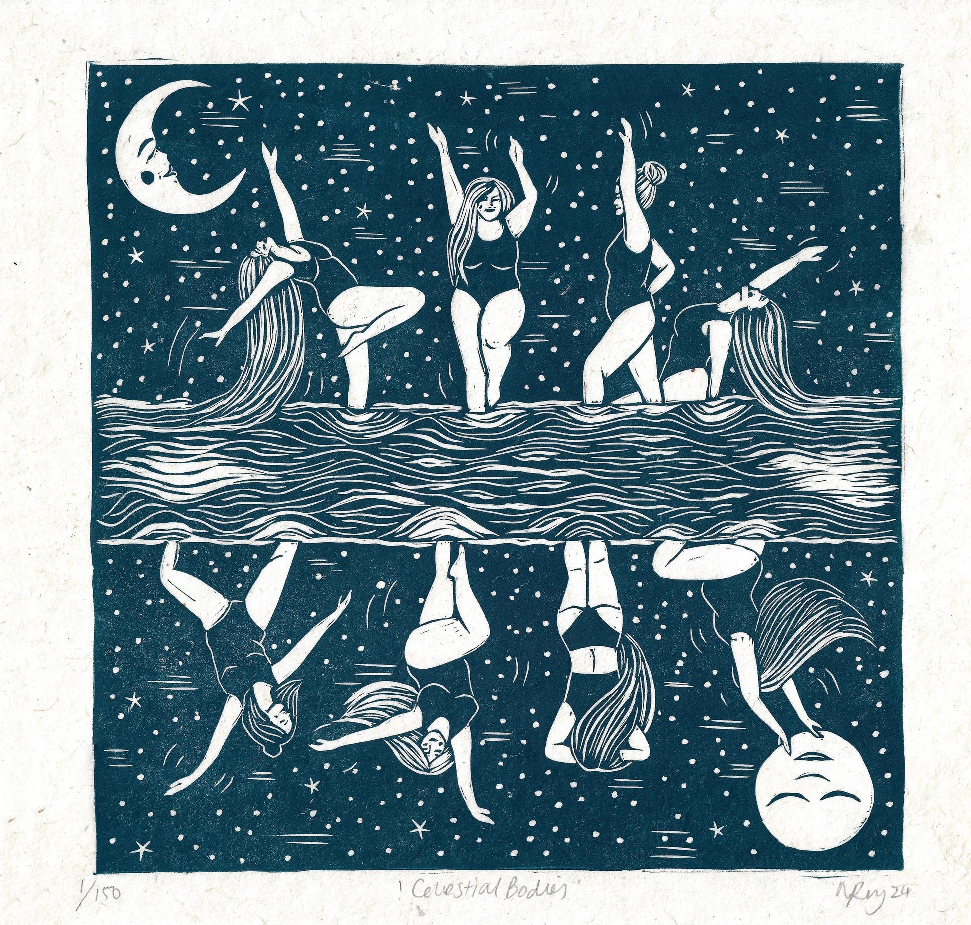 Original linoleum print depicting women dancing in the water under the moonlight. Playing with dark & light.