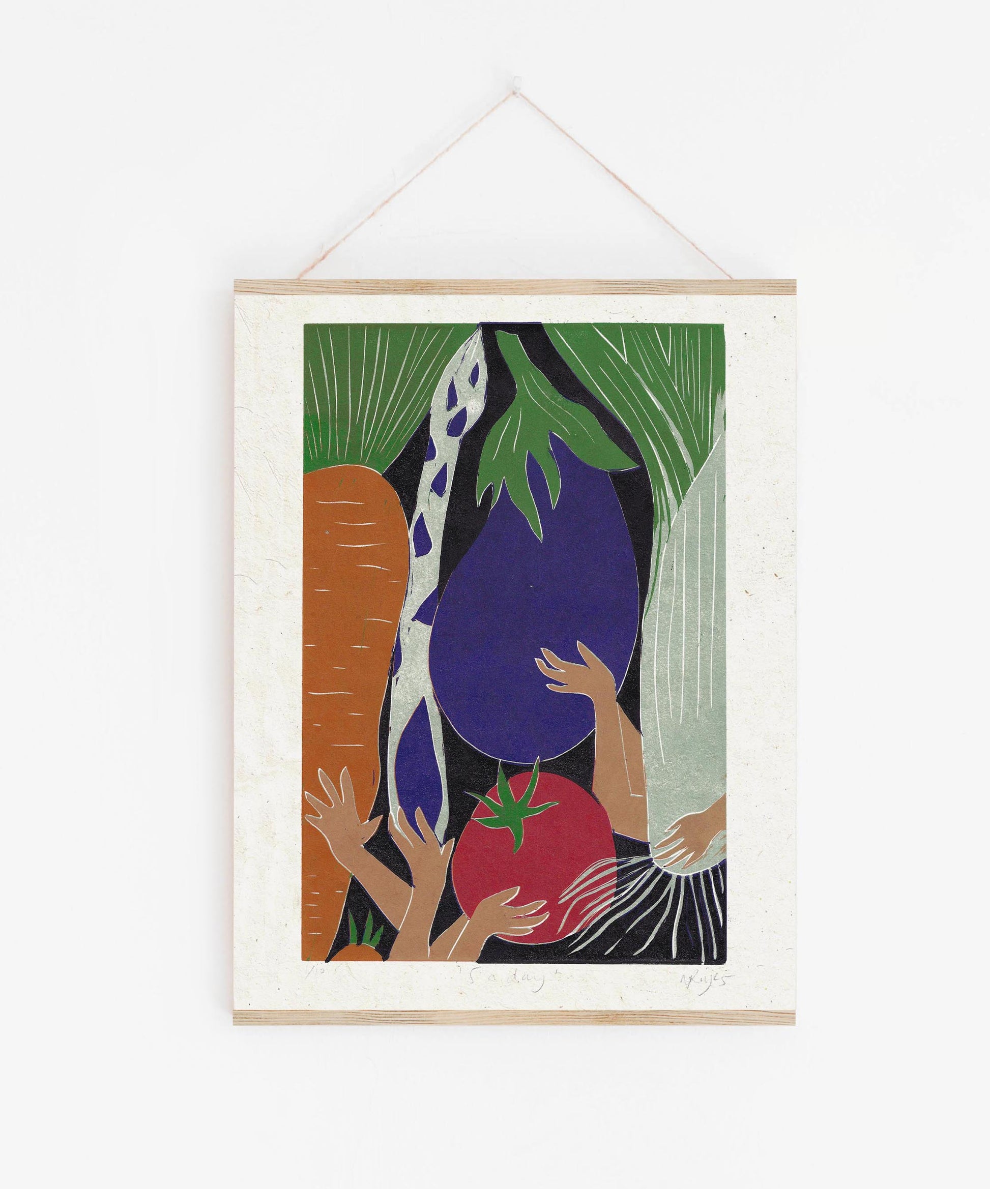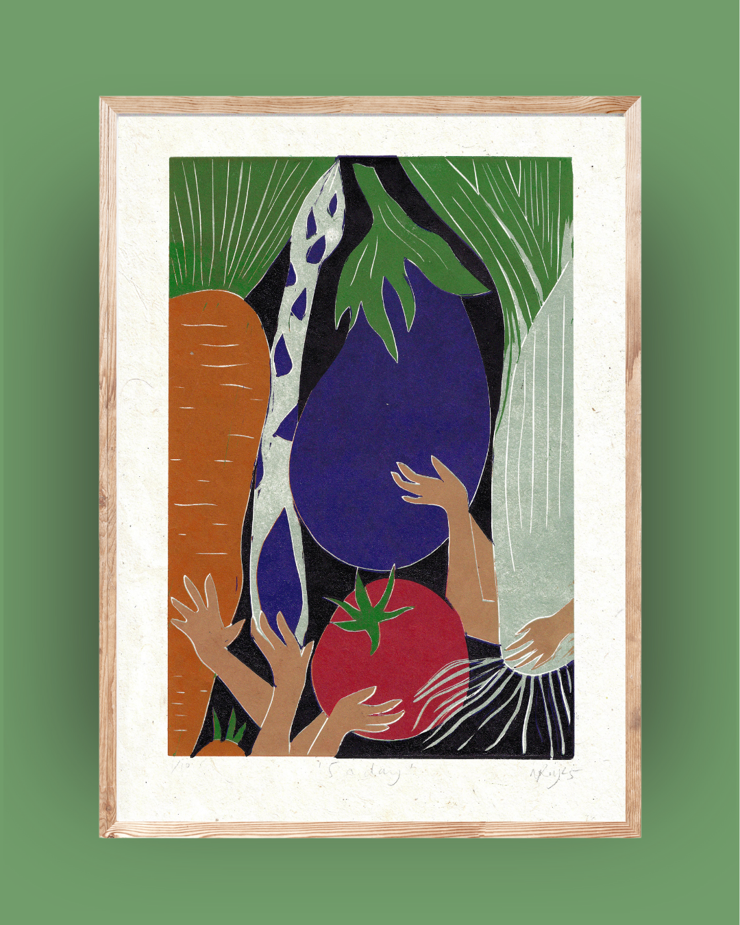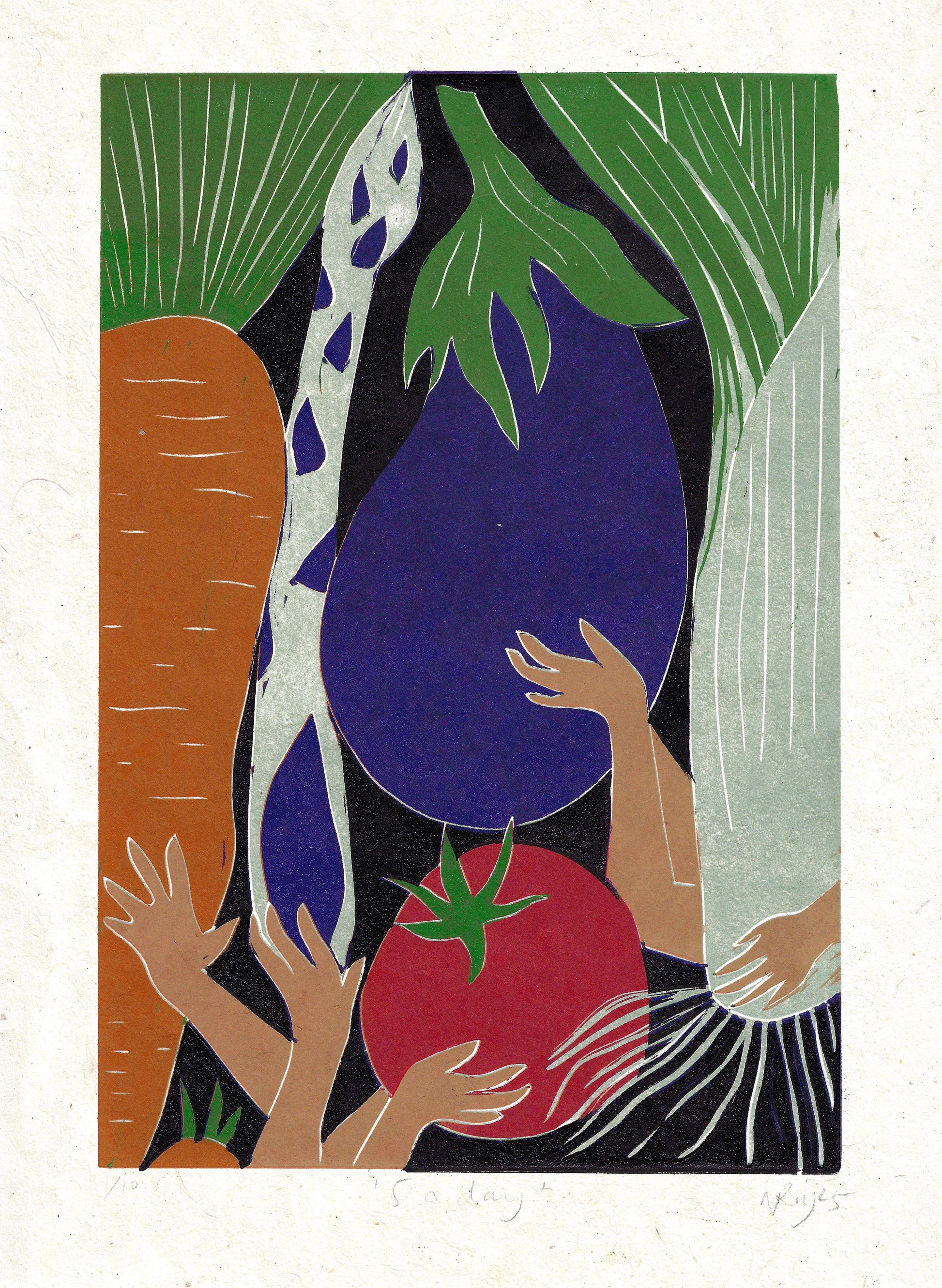 Made using the reduction technique. This is a method of block printing in which each colour layer is taken from the same block. More lino is removed from the block for each layer and each colour is printed on top of the last. This means that an entire edition must be printed in one go – once you have carved into the block for the next layer, you can’t go back to print more. Because of this it is sometimes referred to as the ‘suicide printing’- and so prints from a reduction edition are truly unique.