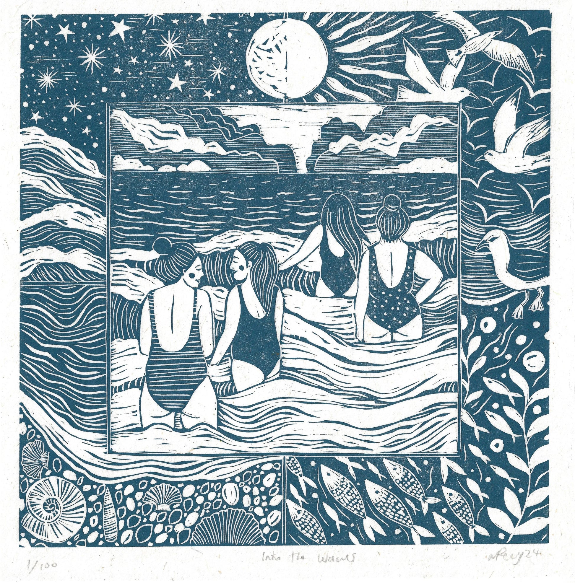 Original linoleum print in a vignette style design depicting women entering a wavey sea as the main image, with 4 separate detailed border images that form one big scene.