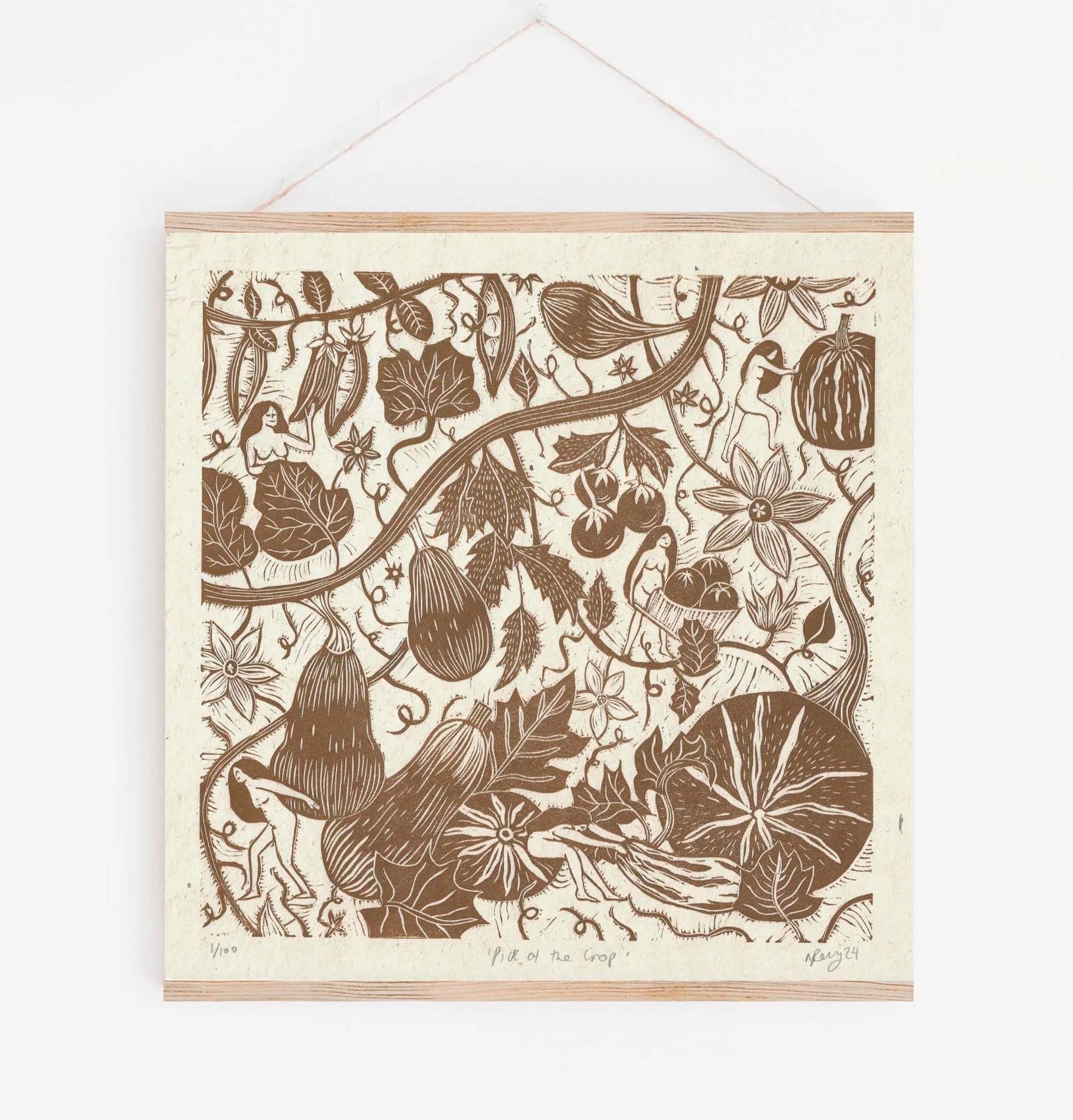 Original linoleum print in a vignette style design depicting tiny women harvesting a crop of vegetables from the vines. Symbolic of abundance & fertility