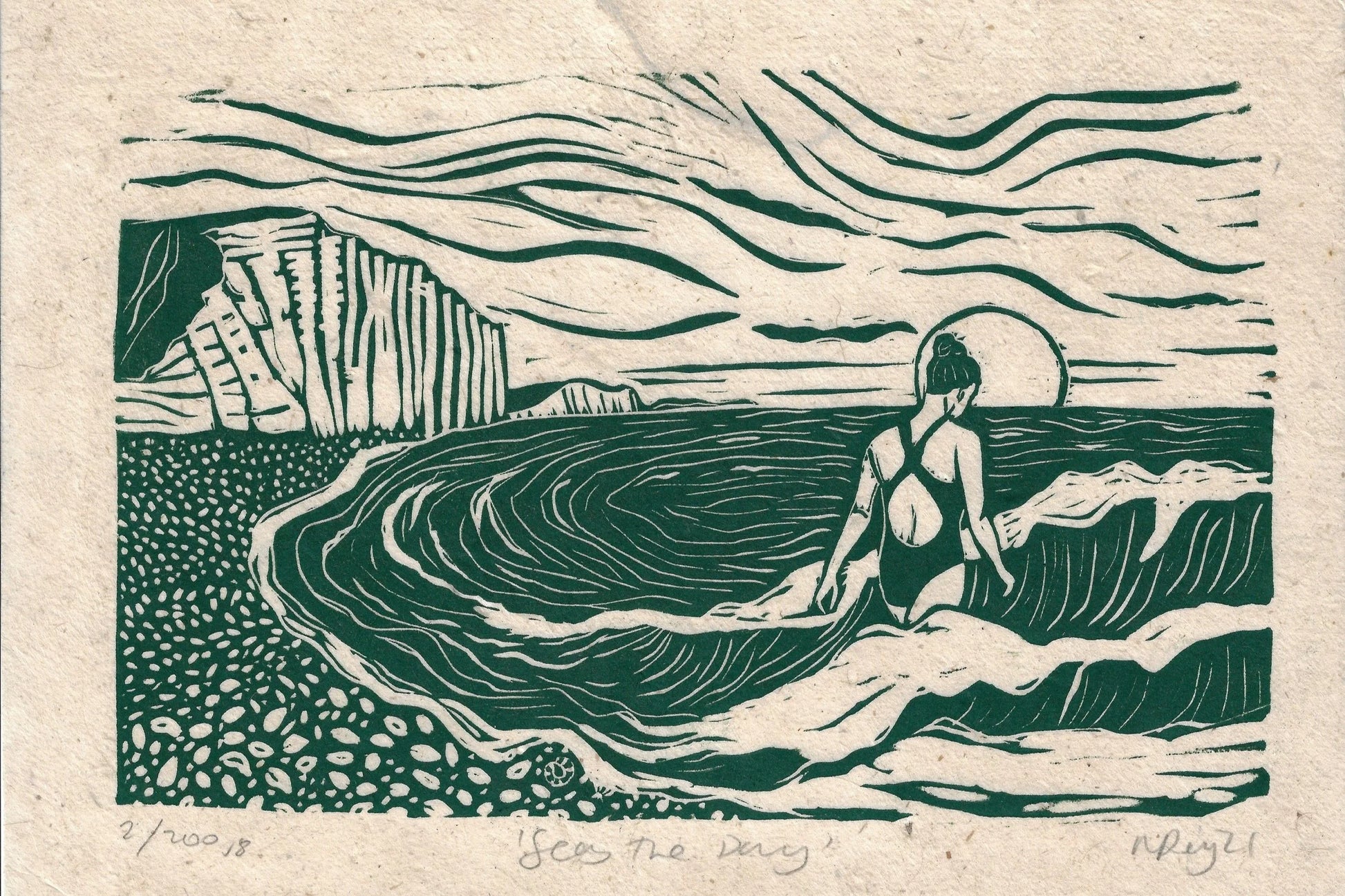 This hand carved linocut print is inspired by adventures in outdoor swimming in Dorset and the surrounding area, the feeling of an early morning sea swim and how it can rejuvenate and revitalise the soul.