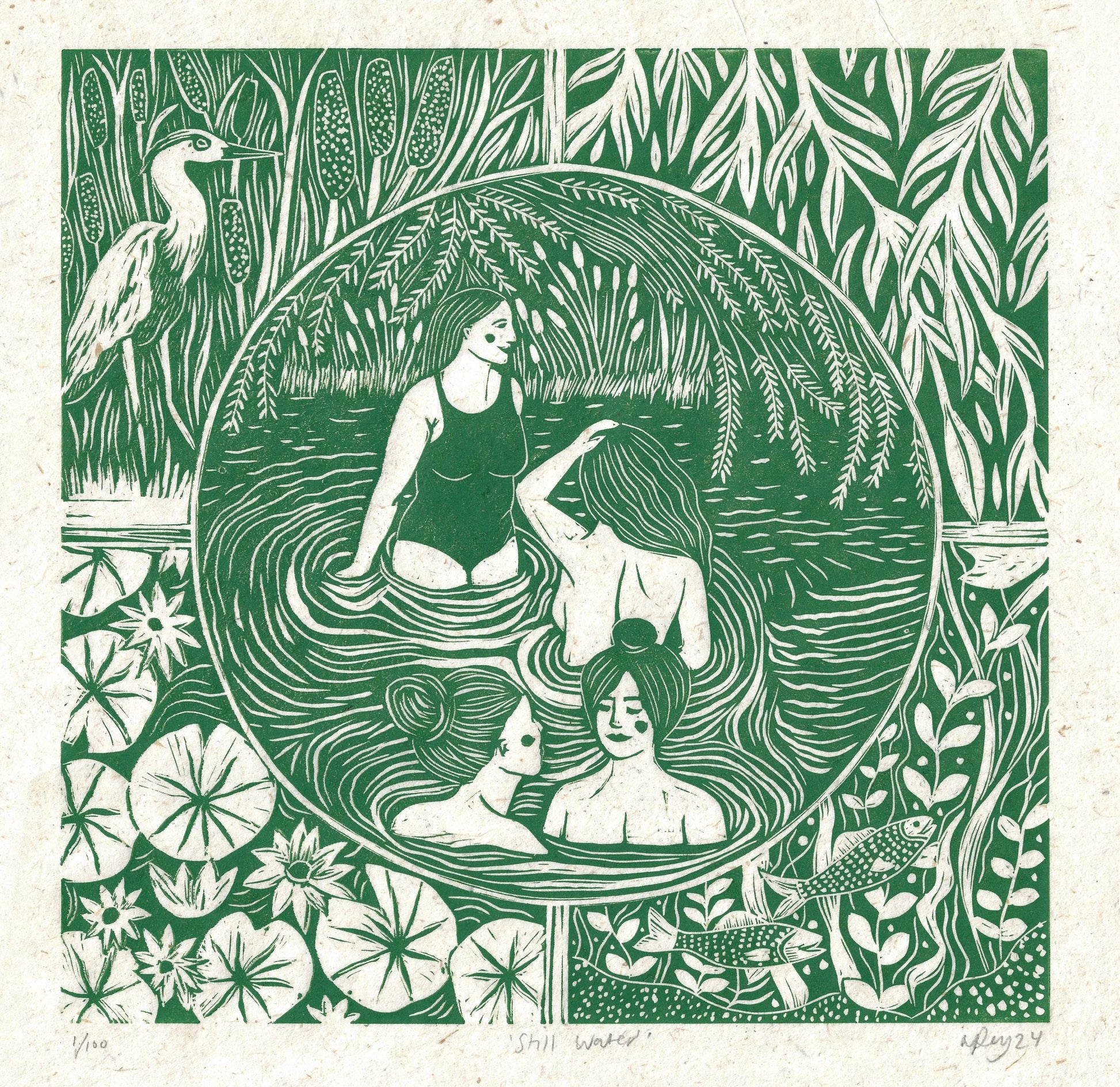 Original linoleum print in a vignette style design depicting women bathing in a river or pond during summer as the main image, with 4 separate detailed border images.