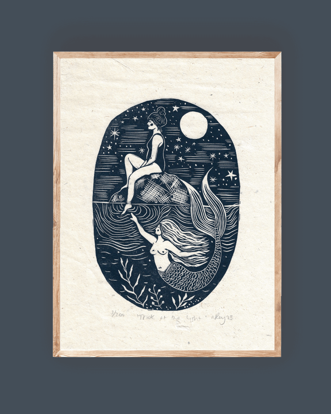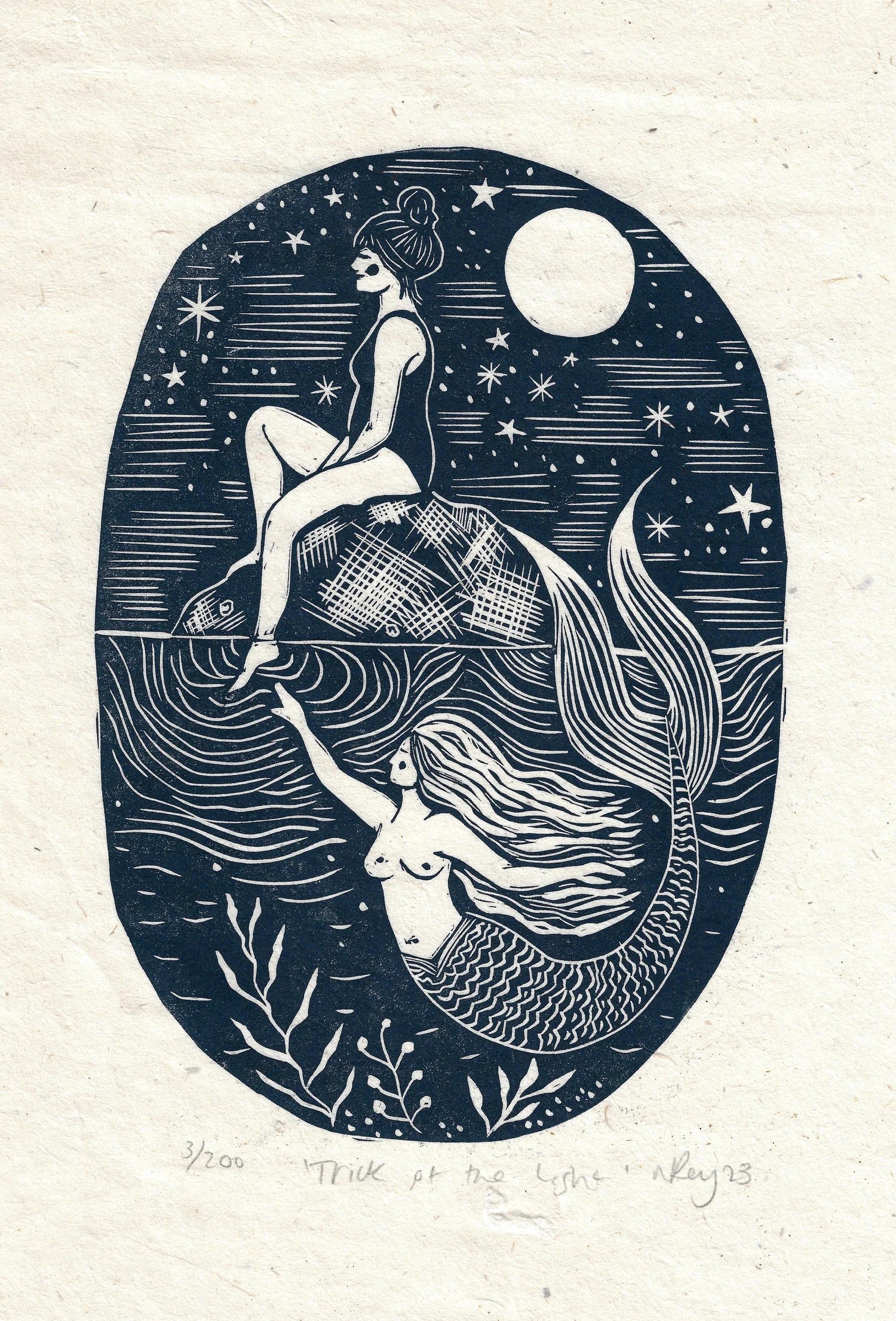 A magical print, exploring the folklore of mermaids and the sea- are they real? What lies in the inky deaths below- is that moonlight on the water a shining mermaid tail? Or just a trick of the light.