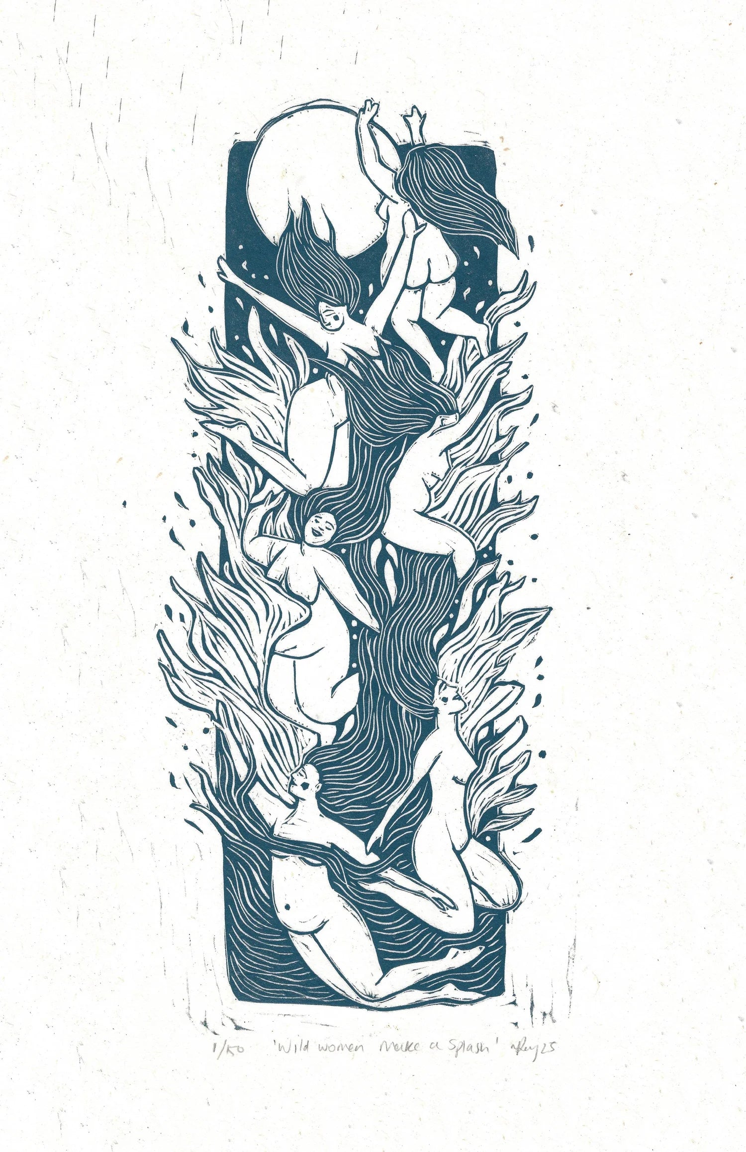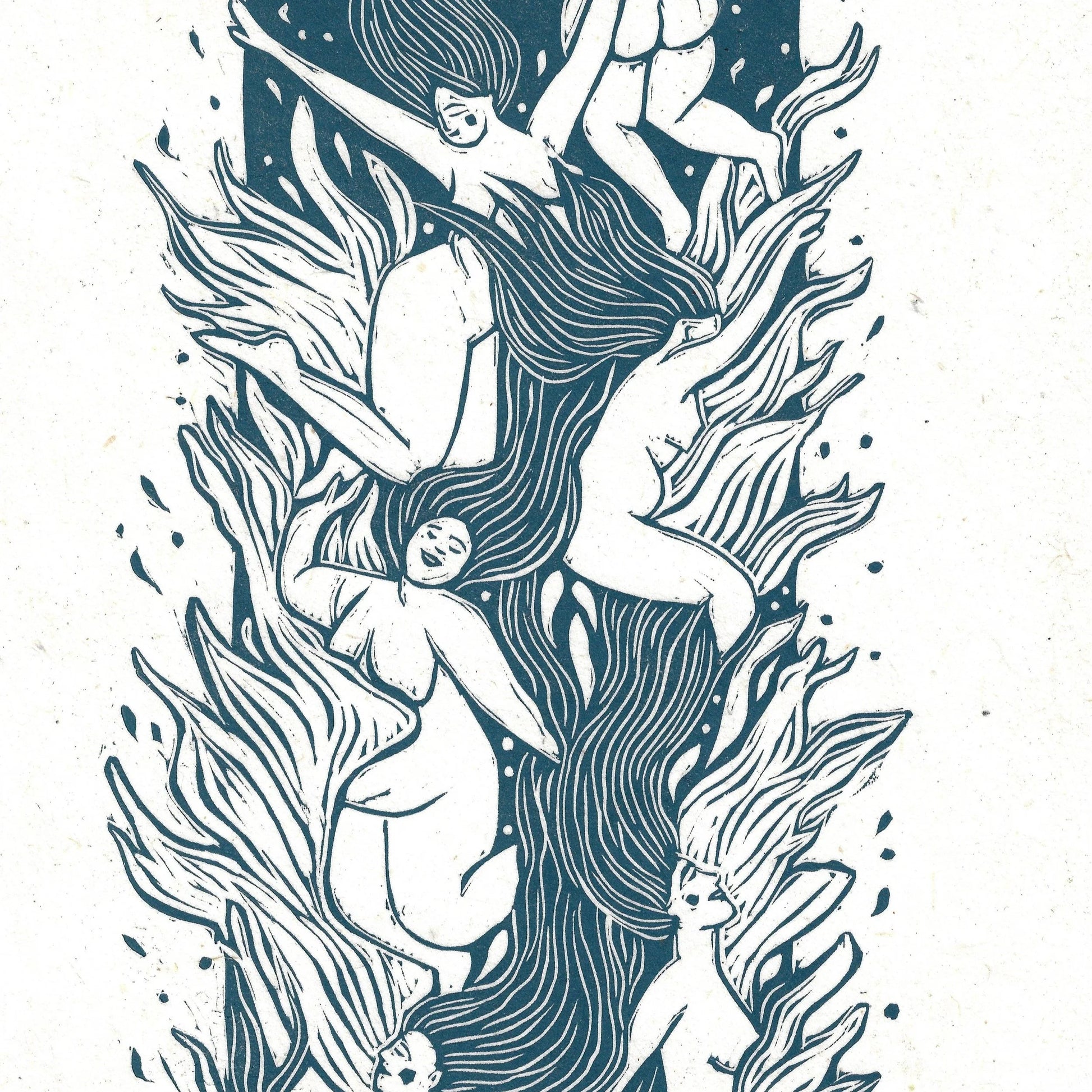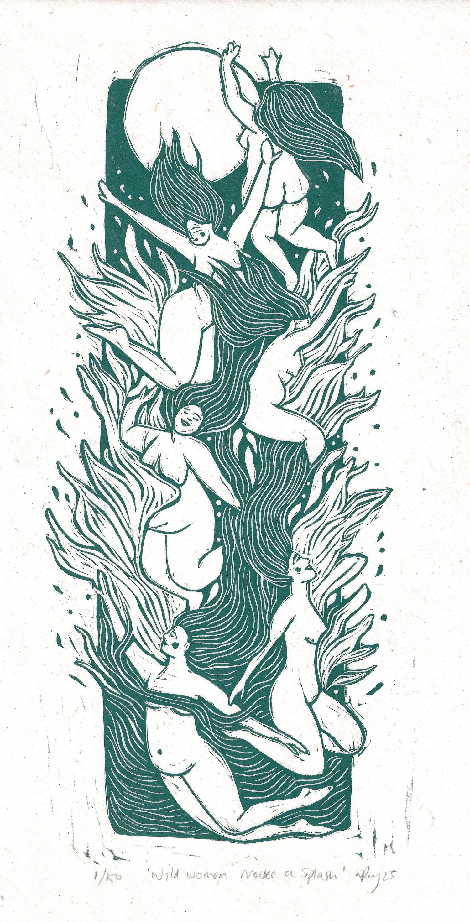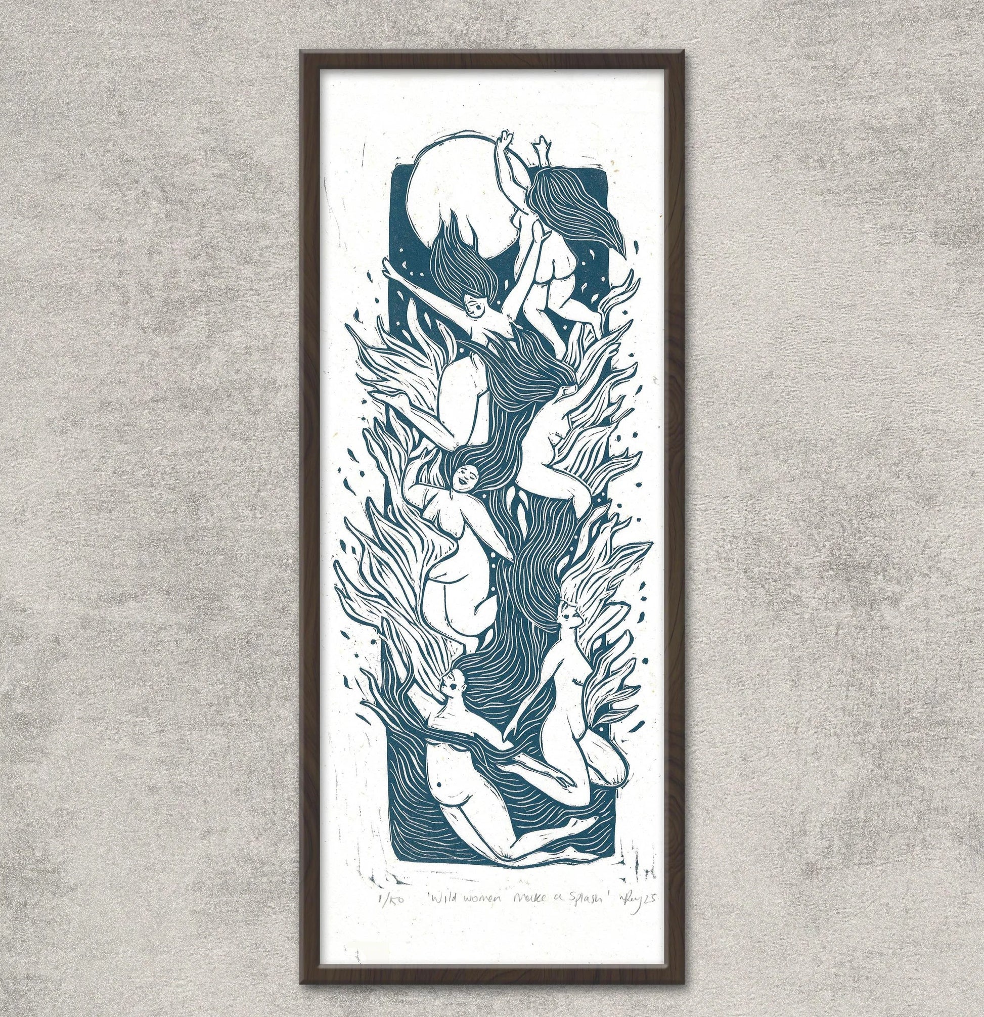 Original linoleum print in a long thin composition featuring women of all shapes & sizes jumping into water