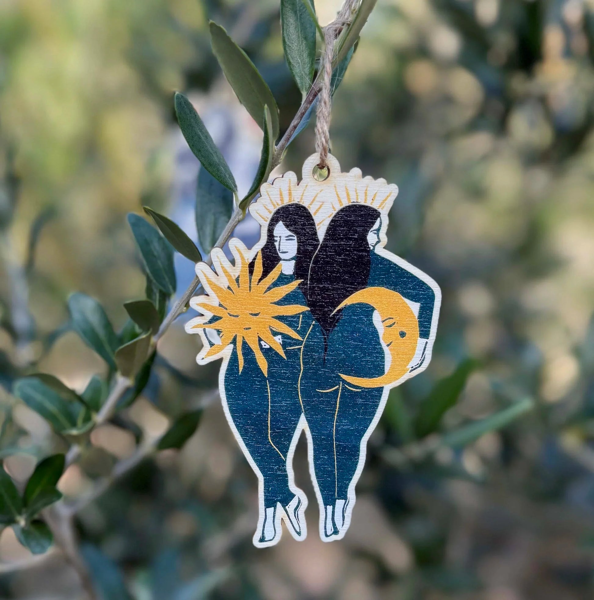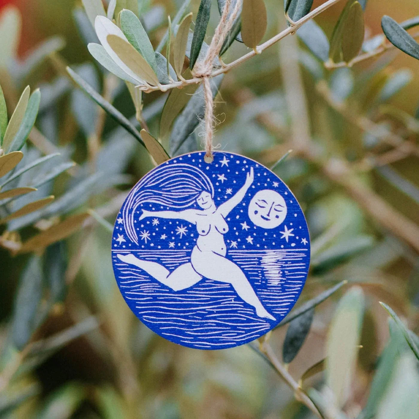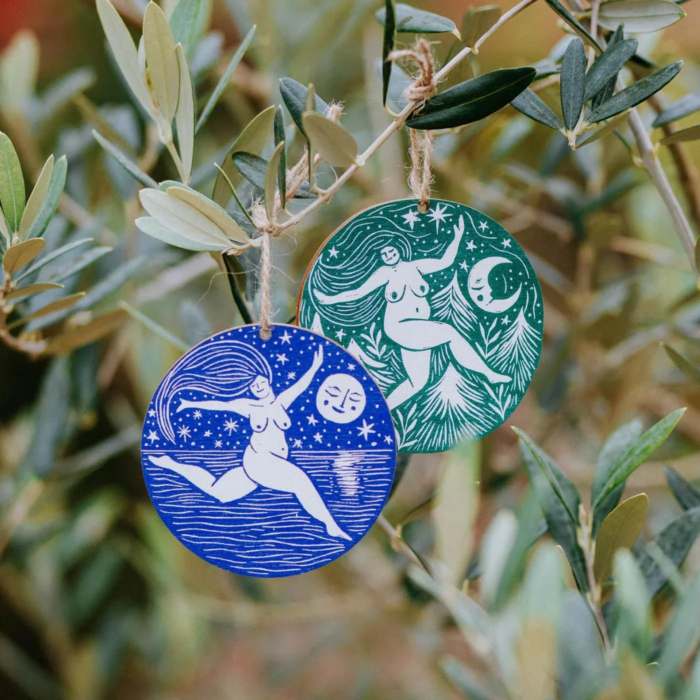 Wooden festive hanging ornaments printed with my Moon & Tree dancing women themed linoprint designs.